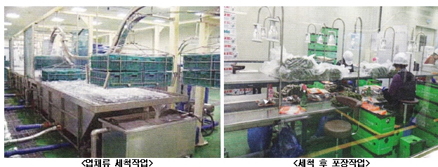 엽채류는 잎 표면에 굴곡과 주름이 많아 한 장씩 세척해야 하며, 엽채 절단부위에서 진액이 나와 미생물이 쉽게 발생해 이를 없애기 위한 살균 과정이 필요하다.