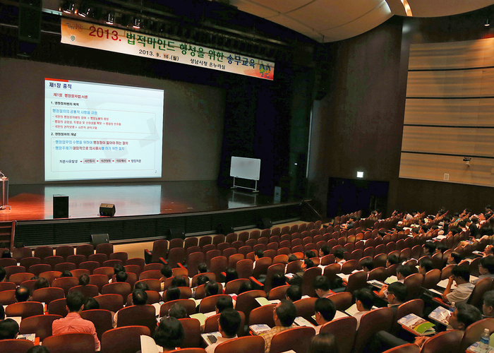 성남시는 오는 3월 12일 오후 1시~6시 시청 1층 온누리실에서 국가(행정), 민사소송 수행 및 행정처분 담당 공무원 300여명을 대상으로 ‘법적마인드 형성을 위한 제1차 송무교육’을 한다.