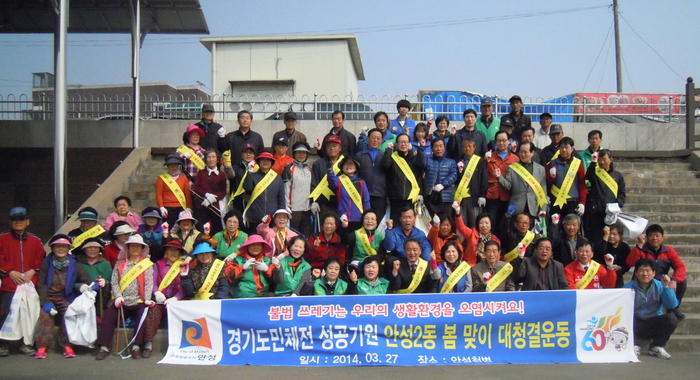 안성2동(동장 김용설)에서는 지난 27일 통장단 협의회(회장 오영식)및 기관단체장 및 회원 100여명이 참석하여 경기도민체전 성공기원 봄맞이 대 청결운동을 안성천변에서 대대적으로 실시했다.