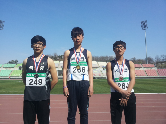 | ▲ 육상 남중100M에서 금메달을 차지한 서천중 나승훈(중앙), 동메달을 차지한 서천중 이용문(오른쪽) 선수 모습 © 나승철 | |
