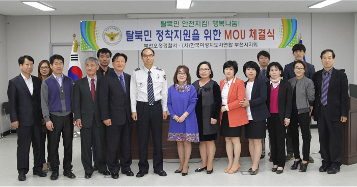 부천오정경찰서(서장 오성환)에서는 지난 18일 14:00경 경찰서 3층 회의실에서 사)한국여성지도자연합 부천시지회(회장 제희정)와 탈북여성 정착지원 협약(MOU)을 체결 하였다."고 밝혔다.