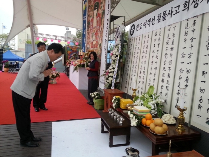 김포 불교계와 시민들이 진도 여객선 사고로 인한 실종자의 무사 귀환을 기원하는 법회를 열고 불의의 사고 실의에 빠진 유가족과 실종자 가족, 국민들의 아픈 마음을 위로했다. 대한불교조계종 중앙승가대학(총장 원행 스님)과 지역 상공인 불자들로 구성된 보현선행회(회장 이영대)는 지난 4월 19일 사우문화체육광장에서 불기 2558년 부처님 오신 날을 맞아 개최 하려던 '경기 서부권 연등문화행사'를 살풀이와 법고, 바라 등 천도제 중심으로 운영하는 한편 행사 후 예정했던 연등행렬도 취소하고 별도의 추모 및 기원법회로 대신했다. 이날 법회를 통해 중앙승가대학 원행 총장스님은 “부처님의 자비가 온누리에 비추는 부처님 오신 날을 앞두고 국민적 염원을 담아 한마음으로 진도 여객선 실종자들의 무사생환을 기원한다”고 발원했다. 또한, 김포 사암연합회 회장 성광스님은 “몸과 맘이 타들어 가는듯한 실종자 가족들과 국민들에게 생환이라는 기쁘고 좋은 소식이 전해지기를 우리 모두의 염원을 담아 기원한다”고 말했다. 보현선행회 이영대 회장도 “부처님 오신 날을 맞아 준비한 경기 서부 연등문화 행사를 진도 여객선 사고 유가족과 실종자 가족은 물론 온 국민의 아픈 마음을 어루만지는 기원 법회로 갖게 되어 남다른 의미가 있다”고 전하며 김포 불교계가 한마음으로 부처님의 가비를 통해 국민적 슬픔을 치유하고 극복하고자 노력했다. 한편, 이날 행사장에는 지역내 각 사찰과 중앙승가대학 학인 스님을 비롯한 불교계 인사와 불자, 시민 등 약 1천여명 법회에 참석했다.