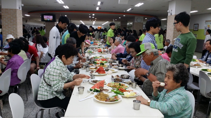 지난 5월 23일, 월곶면 갈산리에 위치한 김포외국어고등학교에서 ‘어르신 공경 큰잔치’가 열렸다. 올해 8회째를 맞는 어르신 공경 큰잔치는 김포외고 학생들이 학교가 위치한 월곶면의 어르신들을 초청해 맛있는 점심을 대접하고, 학교 근처 황토 옥천탕에서 어르신들과 함께 목욕도 하며 친 손주처럼 하루를 보내는 뜻깊은 행사다. 이 행사에 매년 600여만원의 사비를 털어 음식과 차량 등을 지원하는 학교운영위원장 윤명준 회장은 “기숙학교에서 공부만 하는 학생들이 지역 어르신들과 함께 하루를 보내며 봉사의 기쁨을 느끼고 참된 인성교육의 기회가 되었으면 한다”고 행사의 취지를 밝혔다. 이날 김포외고 학생 300여명은 어르신 한 분마다 두 명씩 함께 다니며 어깨를 부축해 드리고 식사를 가져다 드리는 한편, 목욕탕에서는 등을 밀어 드리는 등 몸과 마음으로 느끼는 봉사활동의 시간을 가졌다. 한 여고생은 버스 타는 곳까지 할머니를 배웅하며 “식사 꼭 챙겨드세요”라고 몇 번씩 당부하며 그새 정든 할머니와 헤어지기 싫어하는 손녀딸처럼 아쉬움을 남겼다. 이날 행사는 월곶면 22개 마을 어르신들이 모두 참여할 수 있도록 버스 2대를 임차해 초청인원보다 50여명이 많은 160명이 어르신들이 참여했다. 또한, 행사가 끝난 후에는 마을까지 모셔다 드리고 기념 선물까지 나눠드리며 기쁨과 넉넉함으로 행사를 마무리 했다. 행사에 참여한 강모 할머니는 “공부도 잘하는 학생들이 식사도 차려주고 말벗도 해주고 시원하게 등도 밀어주니 너무 이쁘고 고맙다”며 행복한 미소를 지었다. 이규종 월곶면장도 행사에 참석해 식사하는 어르신 한분마다 손을 잡아드리며 즐거운 인사를 나누고 학교측에는 감사의 말과 지속적으로 추진해줄 것을 당부했다.