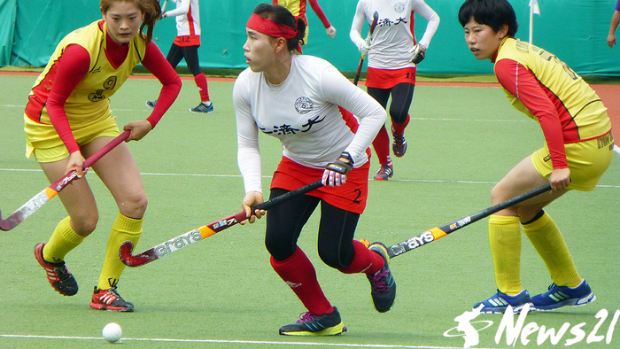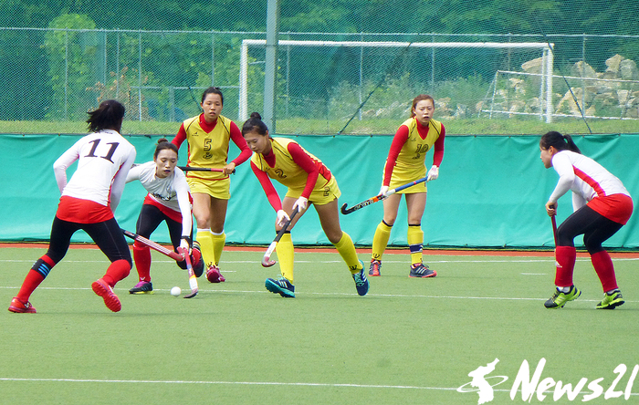 ▲   충북 제천 청풍명월국제하키장에서 개막식에 앞서 열린 경희대와 인제대 경기를 하고 있다.  © 남기봉=기자
