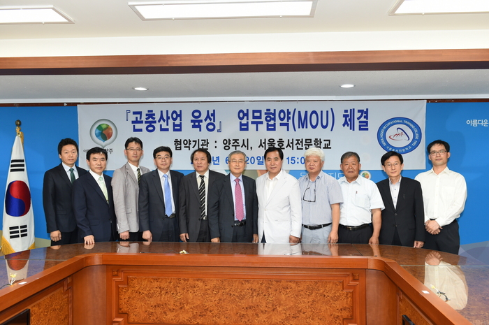 양주시는 20일 시청 제2상황실에서 현삼식 양주시장을 비롯한 서울호서전문학교 이운희 학장, 양주시곤충산업연구회 김경호 회장 등 관계자 15명이 참석한 가운데 곤충산업 육성을 위한 업무 협약식을 가졌다.