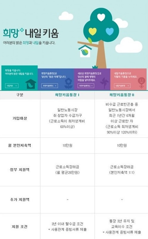 희망키움통장이란, 일은 하고 있지만 저소득계층을 벗어나지 못하고 있는 기초수급자들에게 정부가 근로소득장려금을 추가로 지급하는 제도다.
