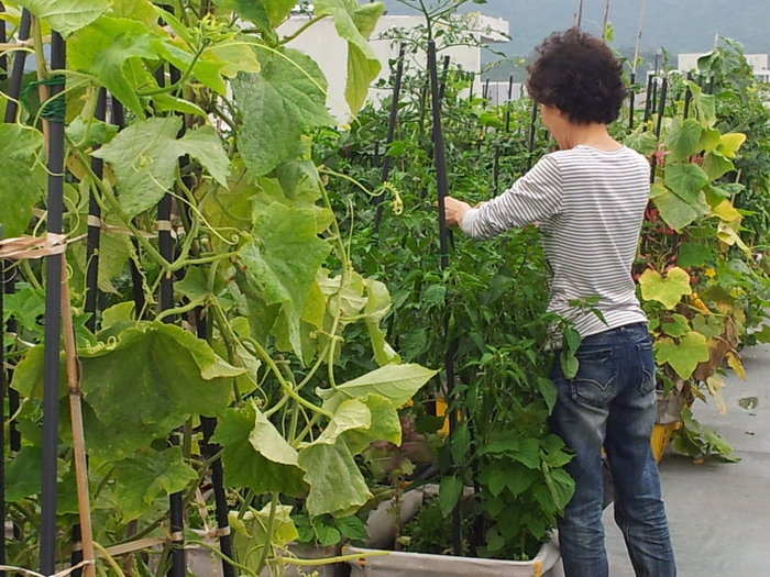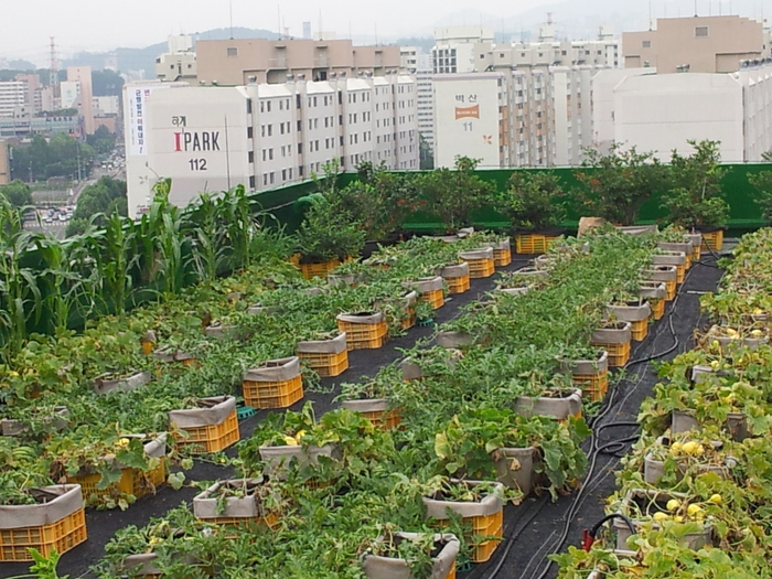 - 아파트 2개동 옥상 총 1121㎡에 고추, 오이, 수박, 참외 등 작물 직접 재배해