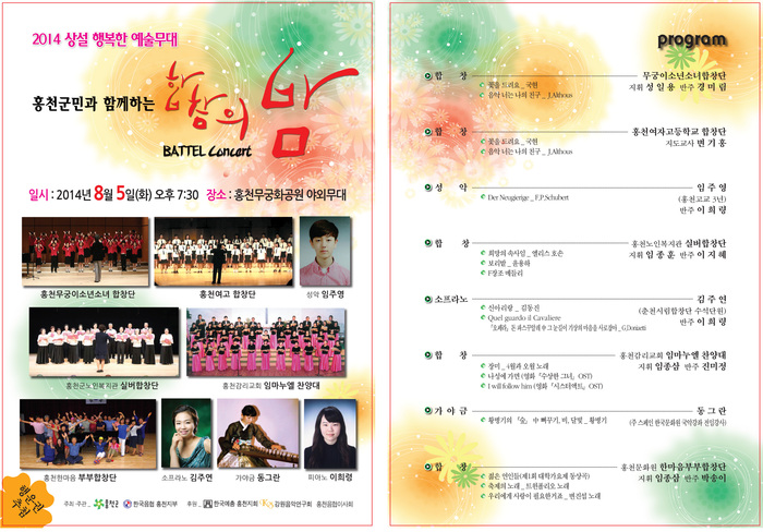 2014 행복한 상설 예술무대 홍천군민과 함께하는 “합창의 밤” 음악회가 8월 5일(화) 오후 7시 30분 무궁화공원 야외무대에서 개최된다.