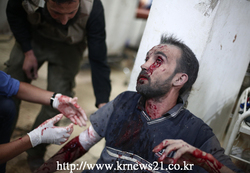 부상당한 한 시리아인이 2014년 10월 3일, 시리아의 수도 다마스쿠스 북동쪽의 도시이자 포위된 반군의 보루 도우마의 임시병원에서 치료를 받고 있다.