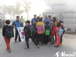 바르게살기운동 충주시협의회 신니지회 임원들이 한글날을 맞아 8일 동락초등학교와 용원초등학교에서 꿈나무들에게 100여개의 태극기 나눠주기 행사를 펼쳤다.