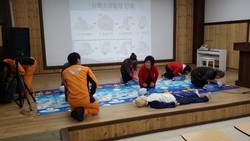 송 후훈련을 진행하였으며, 안전총괄과 직원 10여명이 요양원 건물내 층별로 배치해 대피유도를 하였고, 대부분 중증 장애인분들이 많아 대피속도는 다소 느렸지만 실제상황을 방불케 할 정도로 긴박한 분위기속에 이뤄졌으며 은혜장애인 요양원 지상 주차장 대피장소로 훈련참여 인원을 대피시켜 순조롭게 훈련을 마쳤습니다. 이번 훈련은 지진발생시 심각한 피해가 우려되는 취약한 시설에 대해 지진대비 대피훈련을 하여 실제상황에서의 즉각적인 대응능력을 향상 및 보다 실체적인 재난대응 훈련의 성과를 거두고자 훈련을 실시하였습니다. 또한 훈련종료후 갈말 119안전센터 직원들의 장애인 요양원 요양사 50여명 대상으로 은혜장애인 요양원 1층 강당에서 심폐소생술 교육 및 실습을 1시간가량 실시하였습니다.