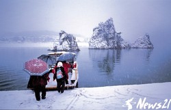 | ▲ 충북 단양군 도담삼봉 눈오는날 강을 건너기 위해 배에 승선하고 있다. © 남기봉=기자 |