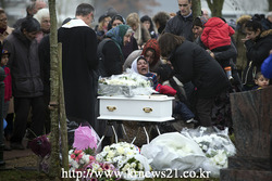 5일(현지시간) 프랑스 마리아 프란체스카의 어머니가 그녀의 아기 관 앞에서 장례식 치루는 모습에 울고 있다.