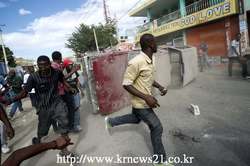 11일 아이티 포르토 프랭스에서 대통령 미셸 마르텔 정부의 행진이 진행되는 동안 아이티 대통령 사임을 요구하는 시위대가 자동차로 거리를 차단했다.