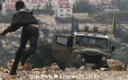 9일(현지시간) 팔레스타인 시위자가 요르단강 서안마을에서 이스라엘 보안군에게 돌을 던지고 있다.