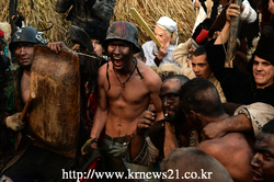 14일 루마니아인들이 전통의상을 입고 체르니 지역의 크라스노야르스크 마을에서 말란카 축제를 축하가고 있다.