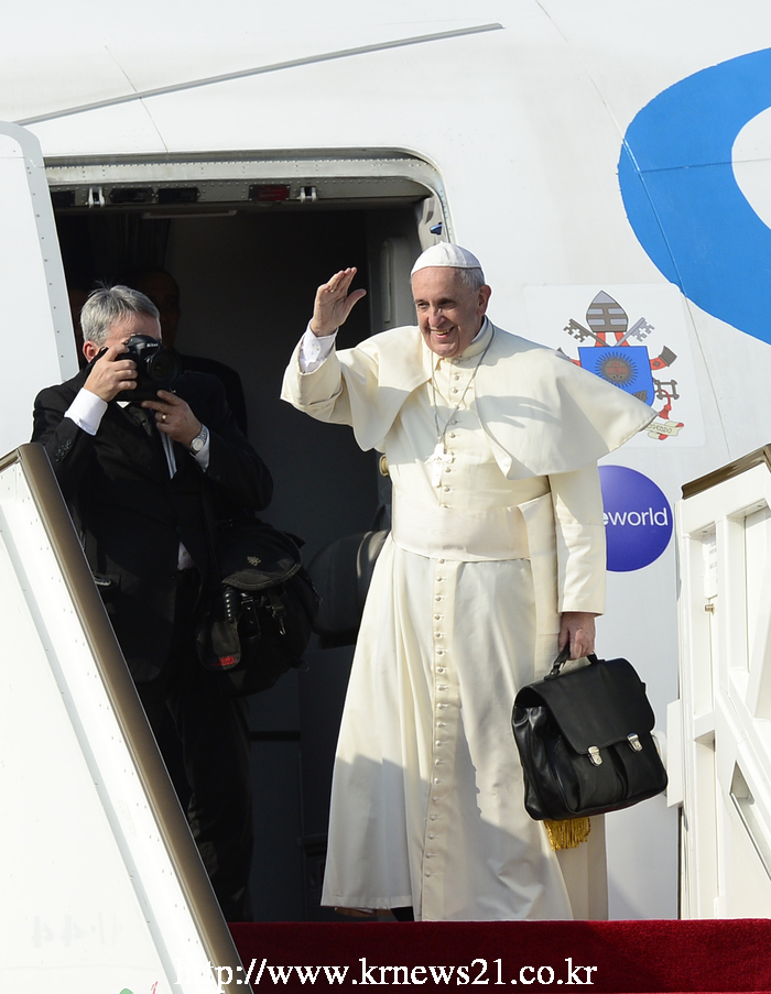 15일 교황 프란치스코가 콜롬보 반다라나이케 국제공항에서 작별 인사를 하고 있다.