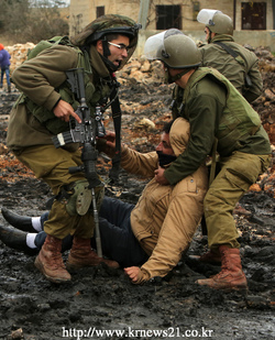 16일 팔레스타인 웨스트뱅크지역 인근 나블루스 카프르카둠 마을에서 팔레스타인이 토지수용에 대한 시위충돌 도중 이스라엘군이 팔레스타인 시위자를 체포했다.