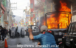19일 멕시코 게레로주 칠판칭코에서 43명 교대생 실종에 대한 정의와 설명을 요구하는 시위 도중 시위대가 경찰을 향해 돌을 던지고 있다.