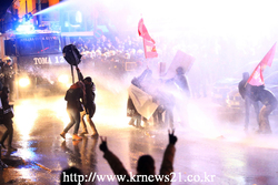19일 터키 앙카라 키질레이 광장에서 터키 언론인 흐란트딩크의 장례식 8주년 추모를 위해 시위대들이 걸어오려고 노력하는 것에 대해 경찰이 시위대를 해산시키기 위해 물대포와 최루가스를 사용하고 있다.