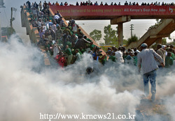 19일 케냐 랑가타에서 초등학생들이 학교운동장을 지키기 위한 시위에서 경찰들이 뿌린 최루가스를 피해 다리로 올라가고 있다.
