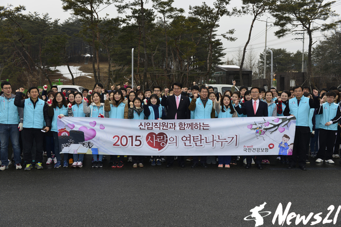 이들 교육생들은 1월 21일 오후 1시부터 제천시 봉양읍 건강축구캠프장에서 김덕수 국민건강보험공단 인재개발원장을 비롯한 이근규 제천시장, 제천시의회 의원, 봉양주민 등 220여 명이 참석한 가운데 연탄 2만장과 봉양소재 지역아동센터에 대한 후원물품 기증식을 가졌다.