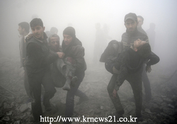 21일 시리아 수도 다마스쿠스 동부 도우마에 시리아반군의 여객기 공격으로 부상자들을 이송하고 있다.