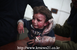 시리아 다마스쿠스 북쪽에 위치한 두마에서 대통령 바샤르 알 아사드의 정부군 공습으로 인해 임시병원에서 시리아 아이가 부상을 입어 치료를 받고 있다.