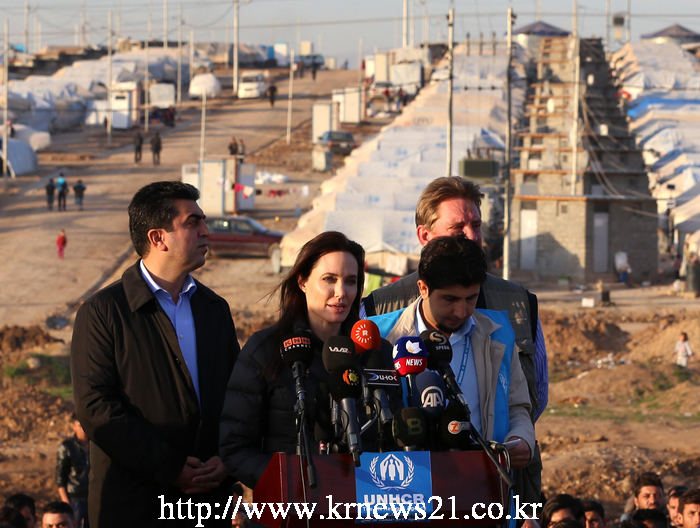 25일 월드스타이자 UNHCR 친선대사로 활동중인 안젤리나 졸리가 이라크 도훅을 방문해 연설을 하고있다.