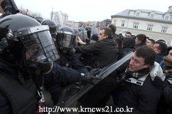 27일 코소보 수도 프리스티나에서 경찰들과 시위대가 충돌하고 있다.