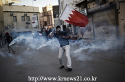 경찰들은 시위대를 분산시키기 위해 최루 가스를 분사하고 바레인 시위대들은 셰이크 알리살만의 집 앞에서 국기를 들고 시위를 벌이고 있다.