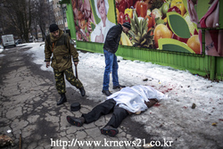 29일 우크라이나 동부 도네츠크에서 정부군와 반군의 교전으로 인해 사망한 남성을 주민과 친러시아군이 보고 있다.