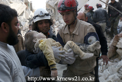 1일 시리아 서북부 알레포에서 시리아정부군의 공습으로 아이들 4명을 포함 총 10명이 사망했고 시리아 민방위 대원이 부상을 입은 아이를 이송하고 있다.