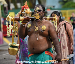 3일 싱가포르 힌두교 축제인 타이푸삼이 진행되는 동안 몸에 페인팅을 하고 우유를 나르고 있다.