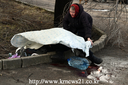 4일 우크라이나 동부 도네츠크의 주거지역에서 한 여성이 우크라이나군과 친러시아 반군의 전투에서 사망한 남성에게 덮개를 덮어주고 있다.