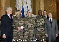 5일 남동부 프랑스 니스의 알프스마리팀의회 회장이 프랑스 군인 상사 자멜과 일등병 에르베,최고 사령관 가빈에게 "용기와 헌신에 대한 명예 매달"을 건네고 기념 사진을 찍고 있다.