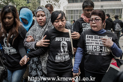 이날 홍콩 법원 앞에서 구타를 한 홍콩 고용주는 고문의 경우로 국제적인 분노를 촉발시켰고 피해 여성은 노동자의 권리에 대한 얼굴로 가정부 지지자의 환호를 받았다.