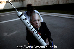 15일 그리스 아테네의 그리스의회 앞에서 벌어진 친정부 시위에서 독일 재무장관 볼프강 쇼이블레의 마스크를 착용한 시위자가 긴축을 표현하는 주사기를 들고 있다.