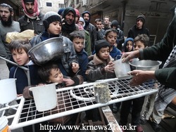 시리아 수도 다마스쿠스의 팔레스타인 난민 캠프에서 주민들이 음식을 받기 위해 줄을 서 있다.