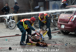 17일 파키스탄 라호르의 경찰 본부 근처에서 자살폭탄테러가 발생해 피해자 시신을 옮기고 있다.