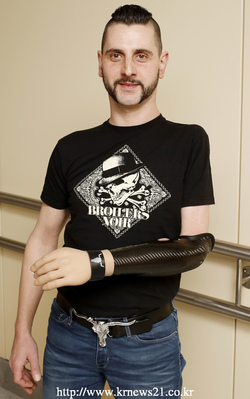 오스트리아 비엔나에서 환자가 인공 팔을 보여주고 있다.