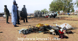 나이지리아 북부 최대 도시인 카노의 버스 정류장에서 쌍둥이 자살 폭탄 테러 현장에 경찰이 서 있다.