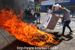 베네수엘라 학생들이 베네수엘라 대통령 니콜라스 마두로 정부에 대한 항의를 벌이는 동안 타이어를 태우고 있다.