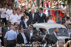 우루과이 대통령 취임식이 열린 펜덴시아 광장에서 우루과이 대통령 다바레 바스케스와 라울 센딕 장관이 시민들에게 손을 흔들고 있다.
