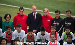 영국 윌리엄 왕자가 중국 상하이를 방문해 프리미어 리그 축구 캠프 교육을 받고 있는 학생들과 기념 사진을 찍고 있다.