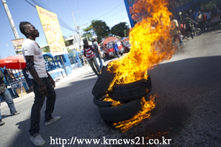 아이티 포르토 프랭스에서 대통령 미셸 마르텔리 사임과 연료 가격 하락을 요구하는 시위에서 타이어에 불을 태우고 있다.