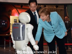 독일 총리 앙겔라 메르켈이 일본 국립 박물관을 방문해 인간형 로봇 아시모와 악수를 하고 있다.