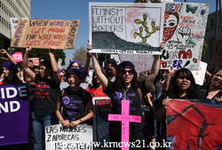 8일 미국 LA에서 1000여명의 여성들이 세계 여성의 날을 맞이해 양성 평등과 여성의 권리 옹호를 하는 행진을 벌였다.