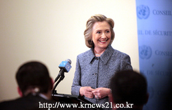 뉴욕에서 전 미국 국무장관 힐러리 클린턴이 유엔에서 여성 능력 강화 및 기조 강연을 한 후 기자들의 질문에 답변을 하고 있다.