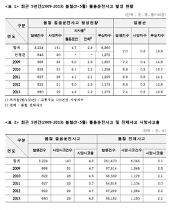 최근 5년간(’09~’13) 봄철(3~5월) 졸음운전 교통사고를 분석한 결과, 매년 645건의 사고가 발생하여 30명이 사망하고 1,272명이 부상당하는 것으로 나타났는데, 매일 7건의 졸음운전사고가 발생하여, 14명의 사상자가 발생하고 있는 셈이다. 졸음운전은 2, 3초의 짧은 순간이라도 운전자가 없는 상태로 수 십 미터를 질주하는 것과 같기 때문에 주변차량이나 보행자에게는 큰 위협이 된다.